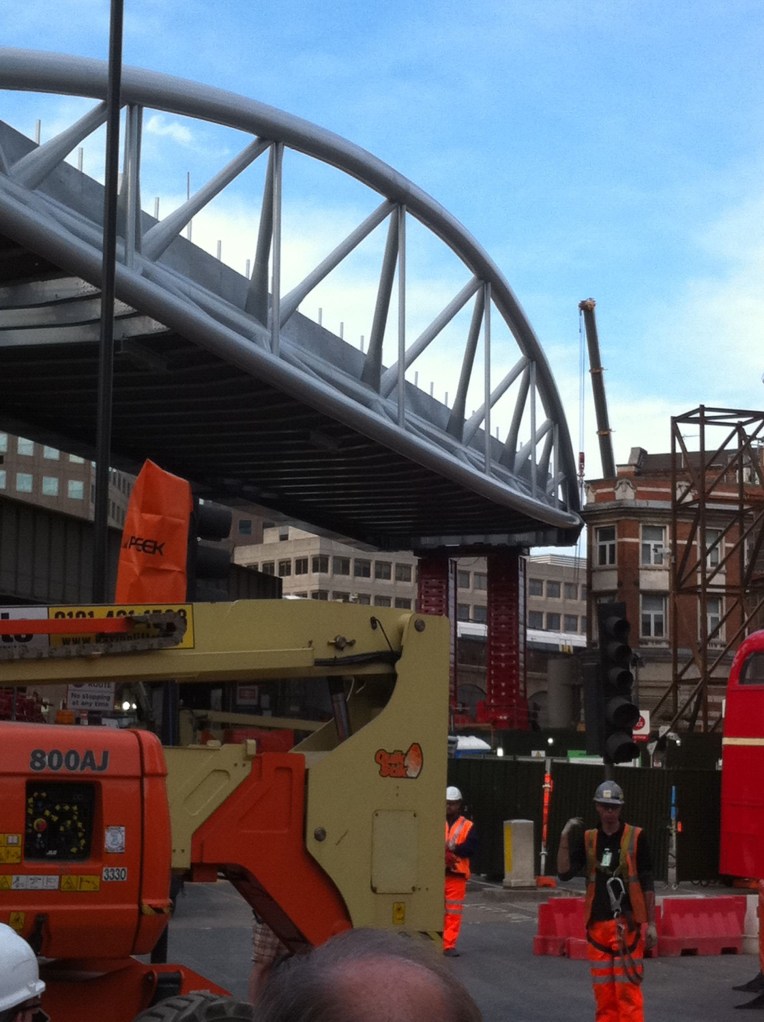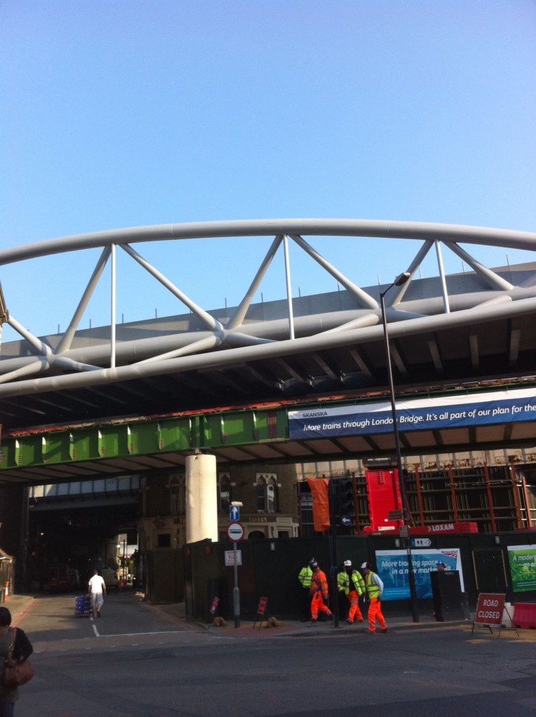 Two views of Borough High Street earlier today. The first shows the new Thameslink bridge on 30 April waiting to be moved across the road. The second shows it having been moved across the road on jacks waiting to be lowered into place later this evening.