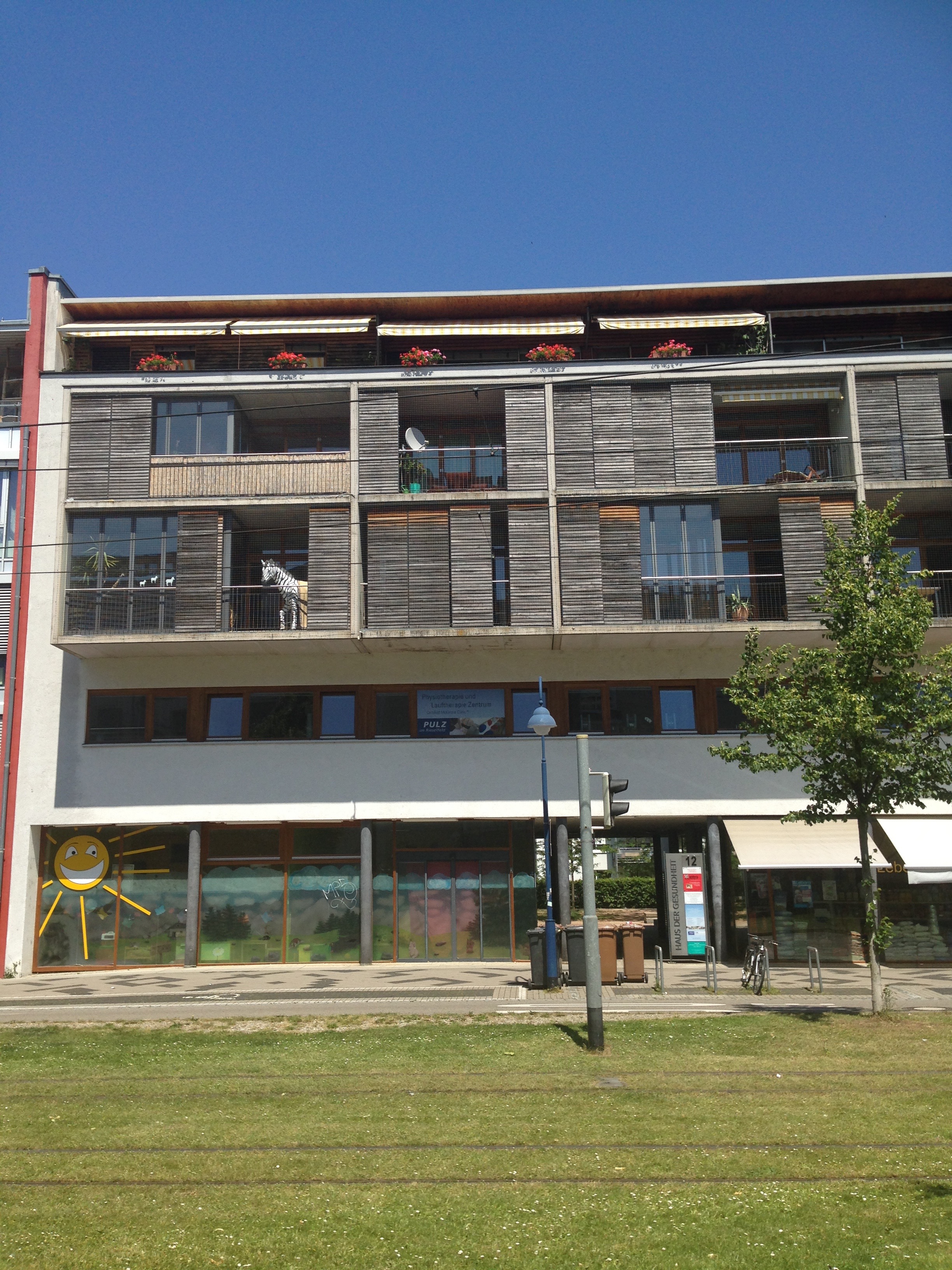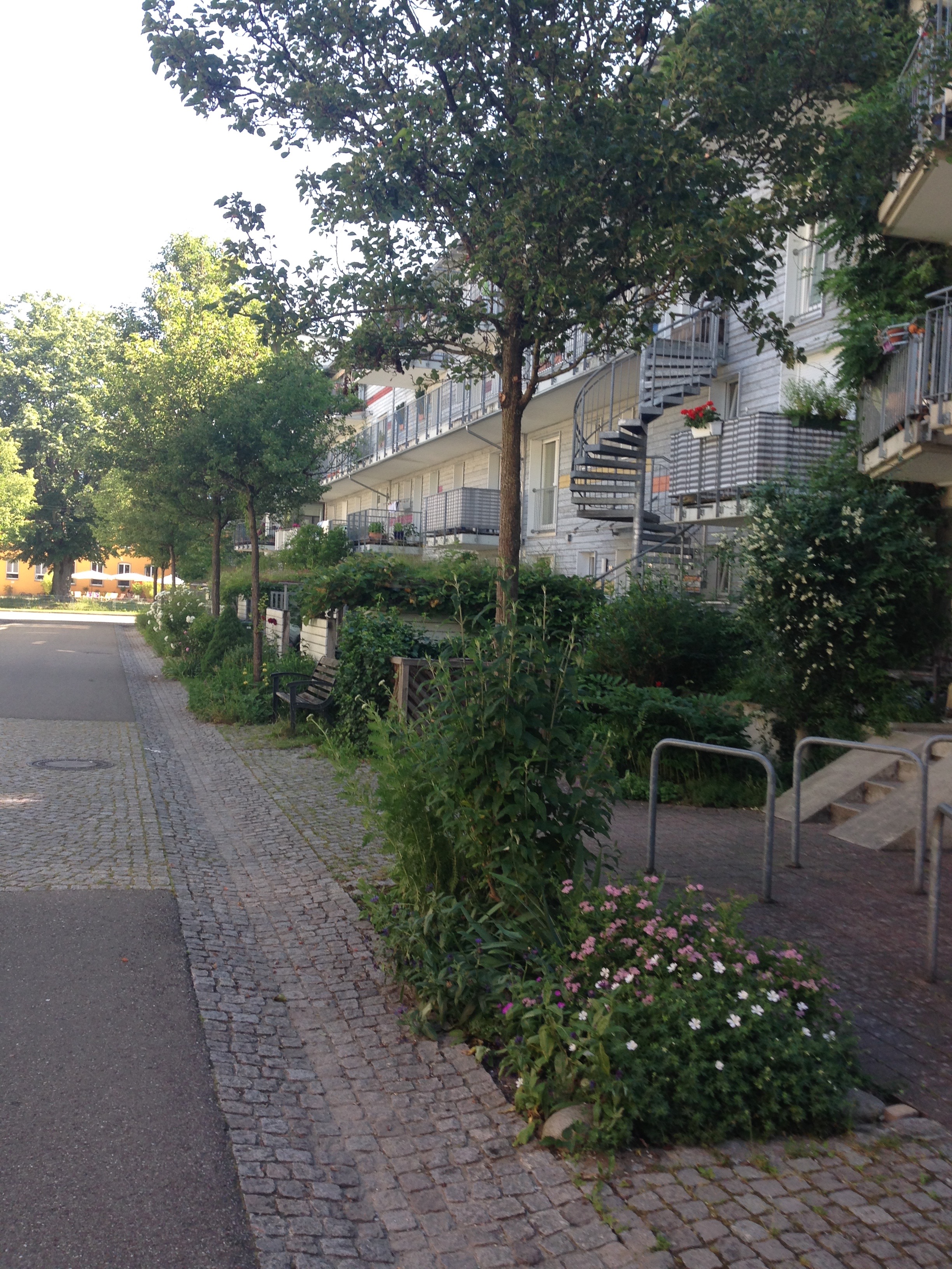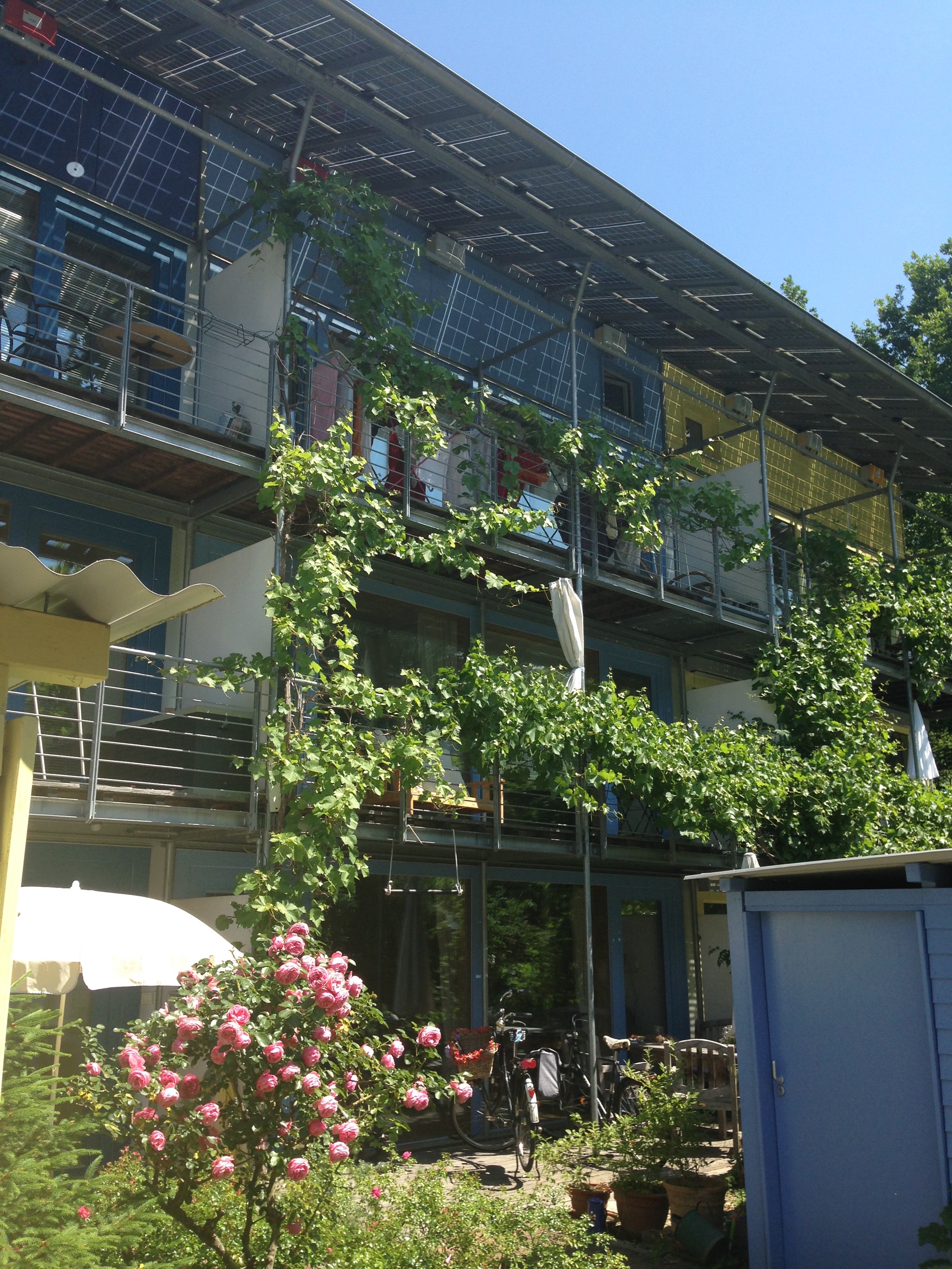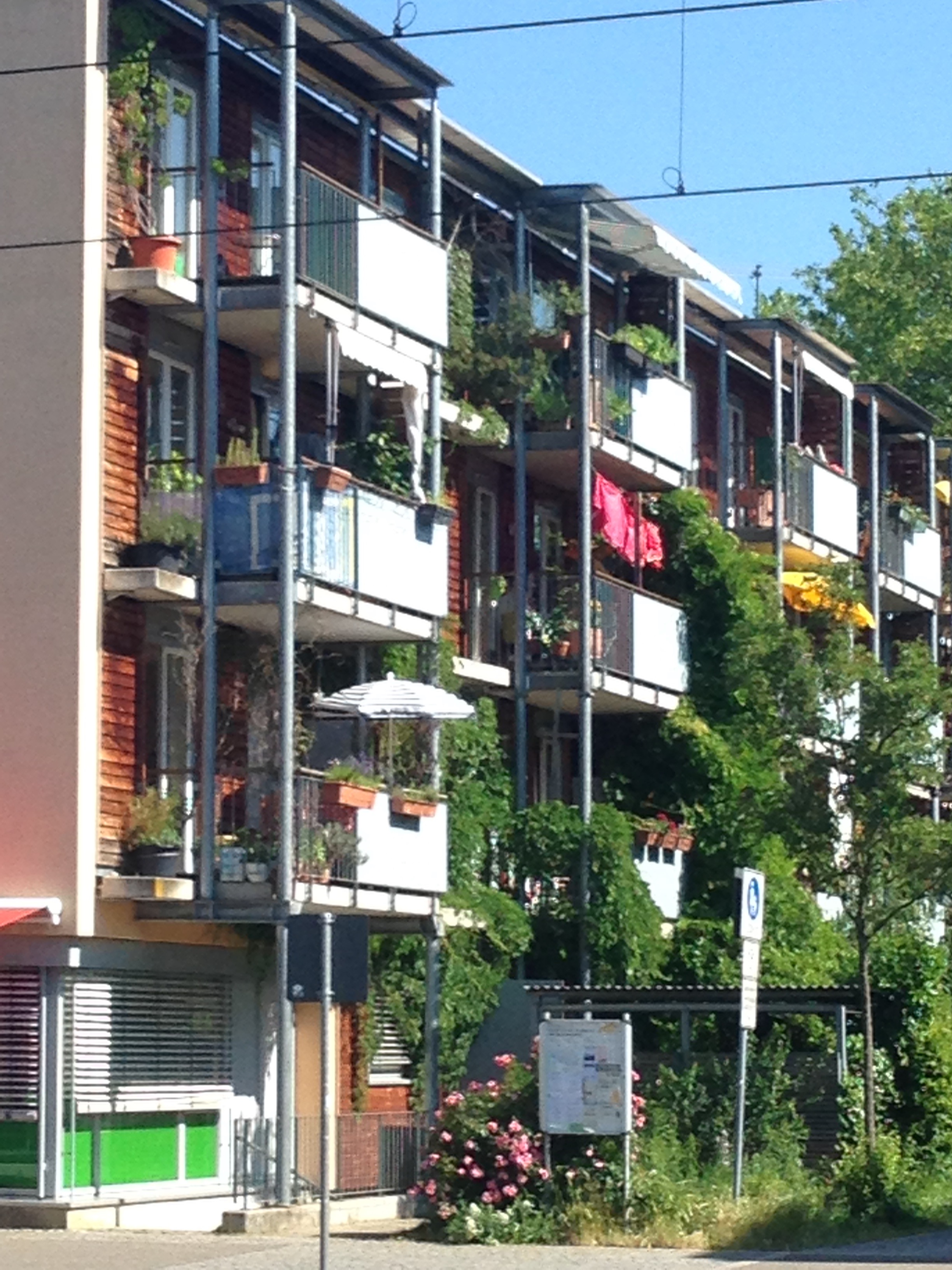 I visited Freiburg on holiday and the images below tell a story of ingenuity, homeliness, respect for children, shared green places, a joy in walking and cycling; and a commitment to the generation of solar energy. Very few of these pictures illustrate radical approaches to architecture as many of the buildings are simple five-storey apartments blocks. Houses are generally terraced but there are no detached garages and very few cars. What connects so many of the apartments are balconies large enough live on; solar panels on most roofs; space to park bikes; narrow streets that give priority to children; green roofs; colourful walls; and places that feel humane and homely. Freiburg has created its own traditions which set standards for sustainability and community.