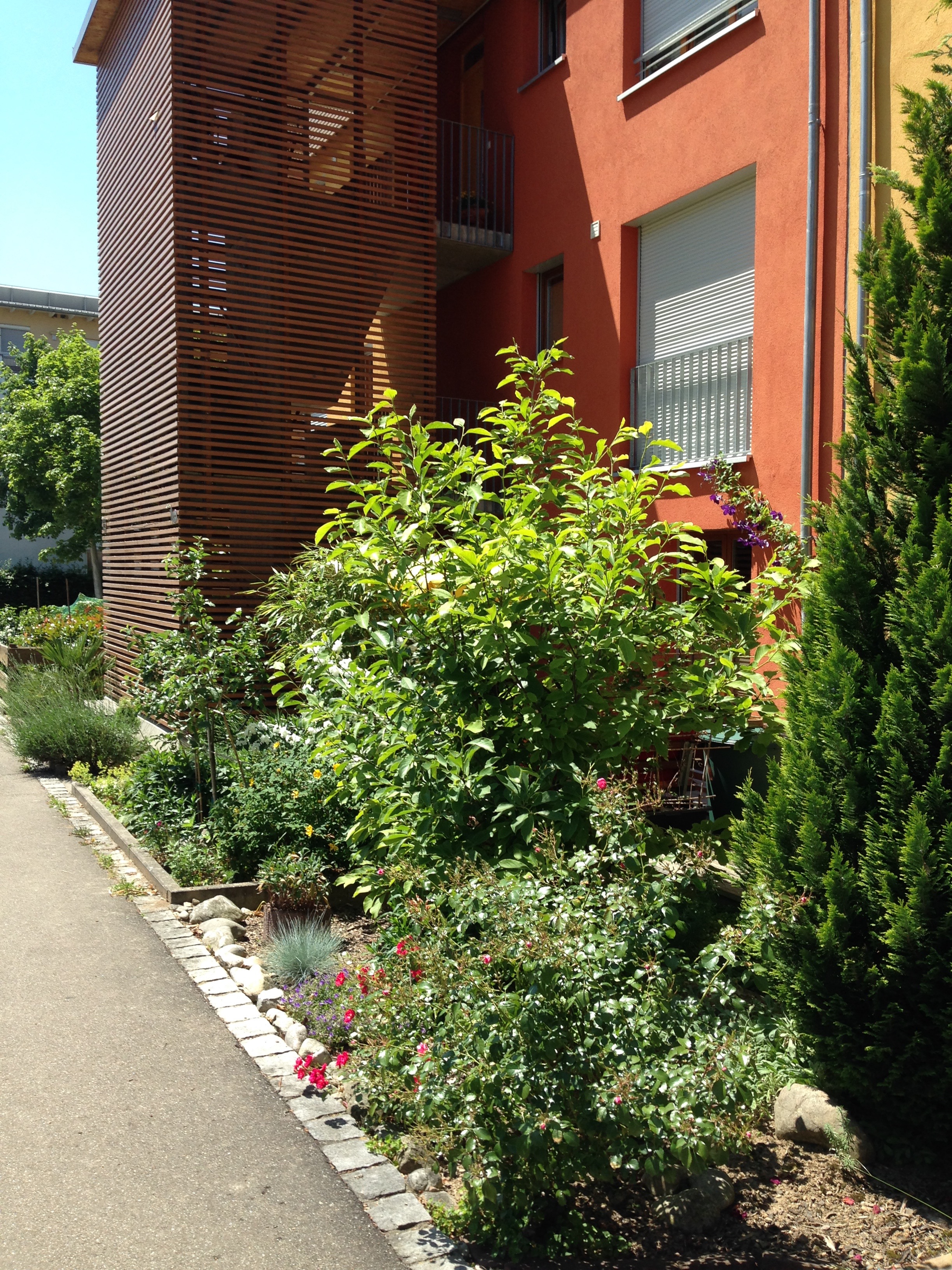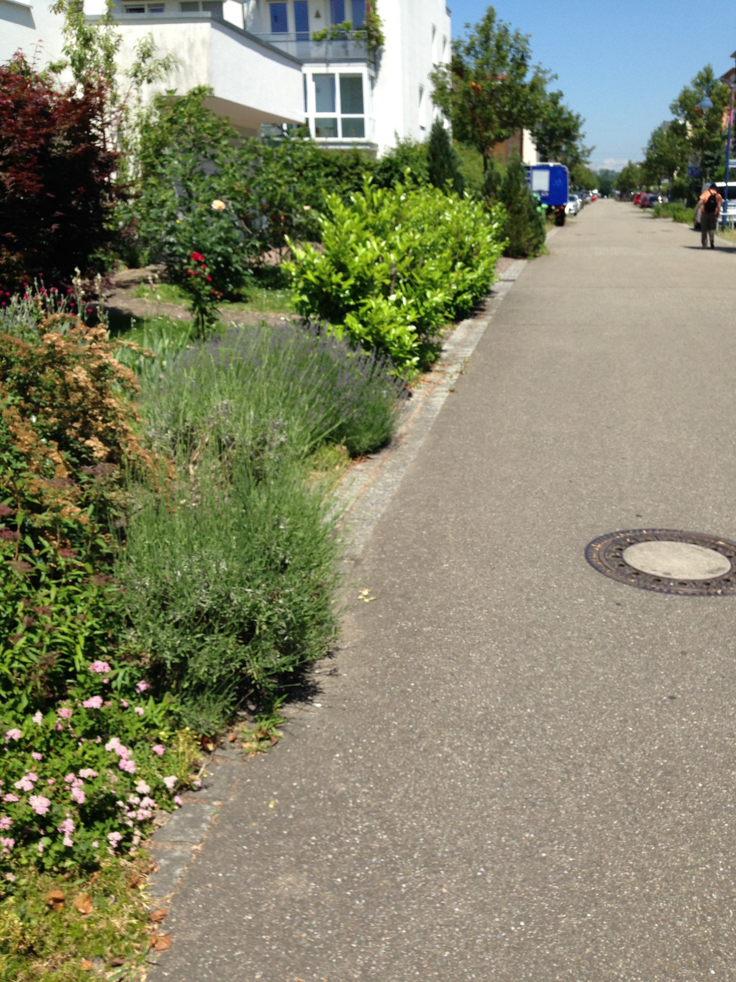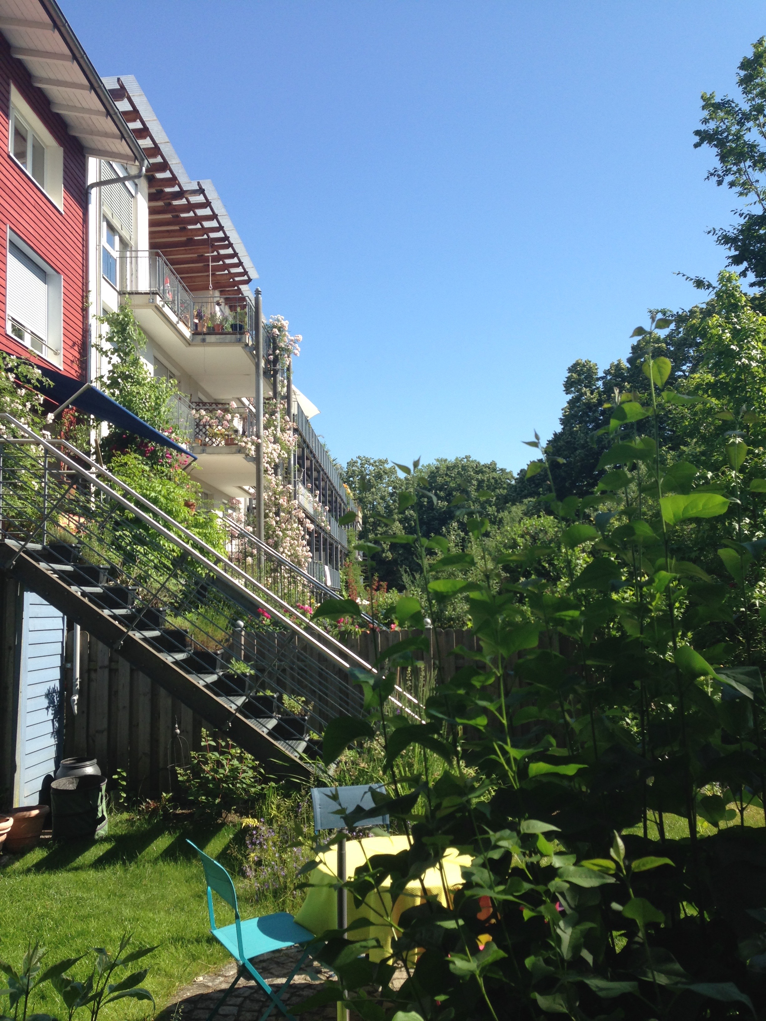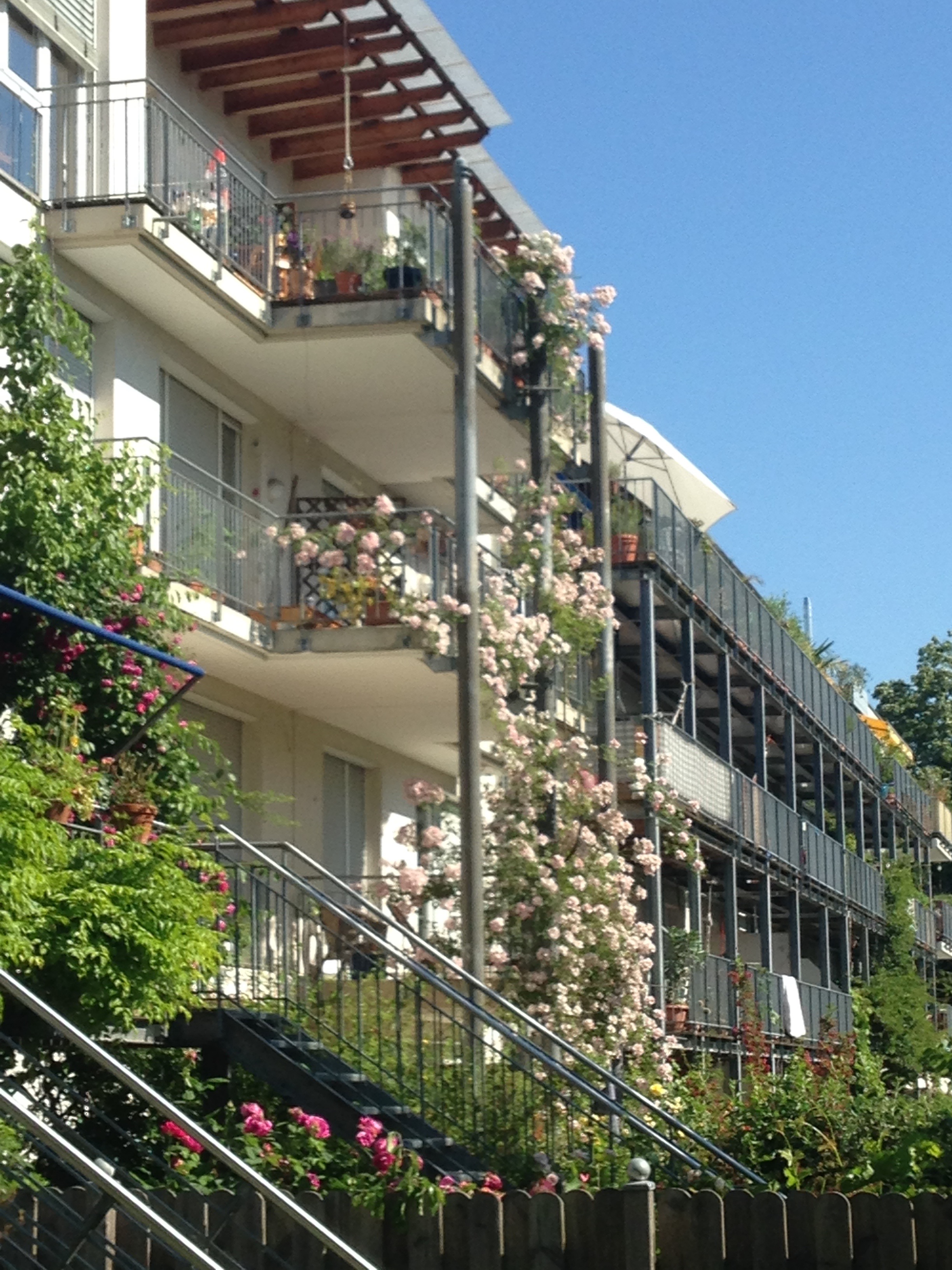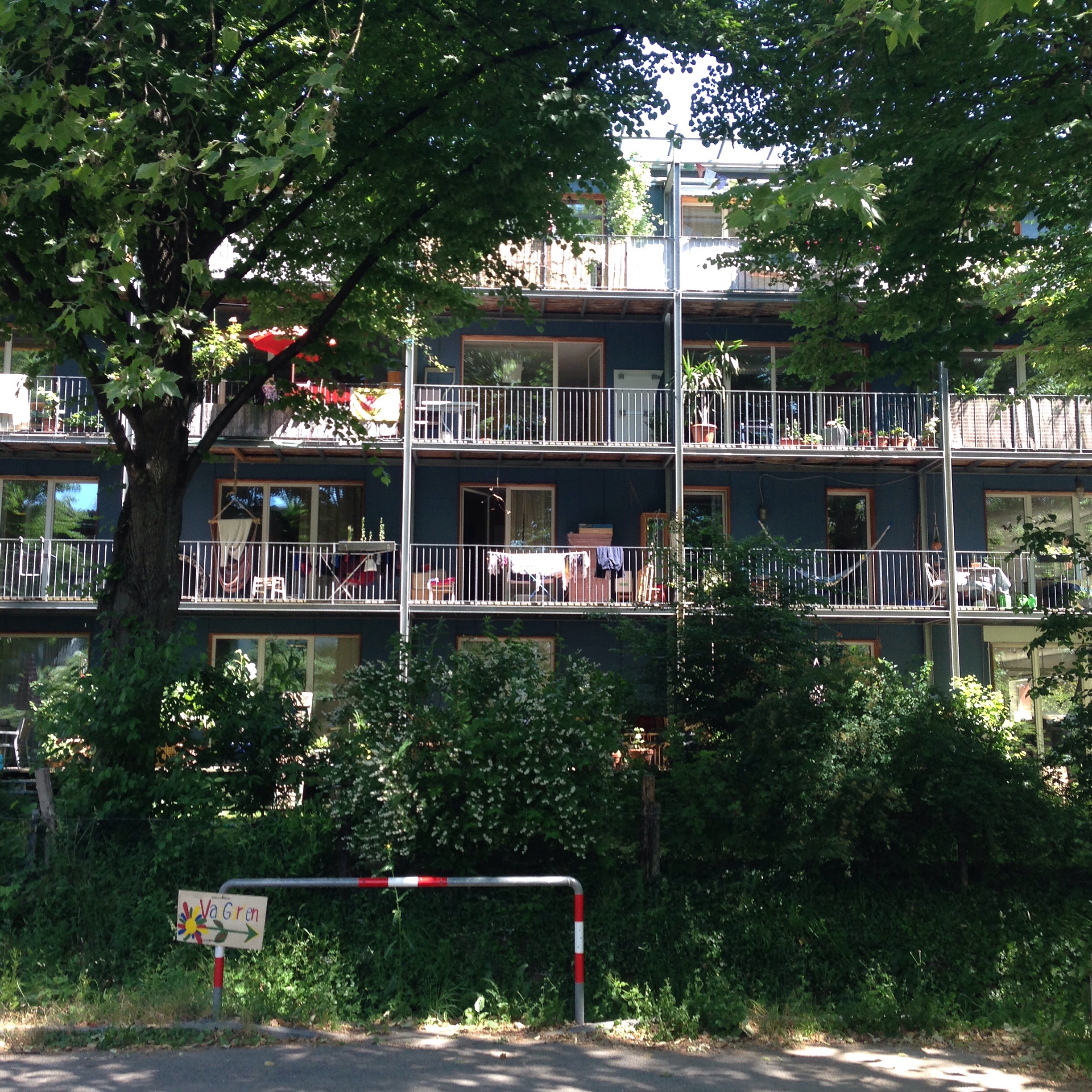 I visited Freiburg on holiday and the images below tell a story of ingenuity, homeliness, respect for children, shared green places, a joy in walking and cycling; and a commitment to the generation of solar energy. Very few of these pictures illustrate radical approaches to architecture as many of the buildings are simple five-storey apartments blocks. Houses are generally terraced but there are no detached garages and very few cars. What connects so many of the apartments are balconies large enough live on; solar panels on most roofs; space to park bikes; narrow streets that give priority to children; green roofs; colourful walls; and places that feel humane and homely. Freiburg has created its own traditions which set standards for sustainability and community.